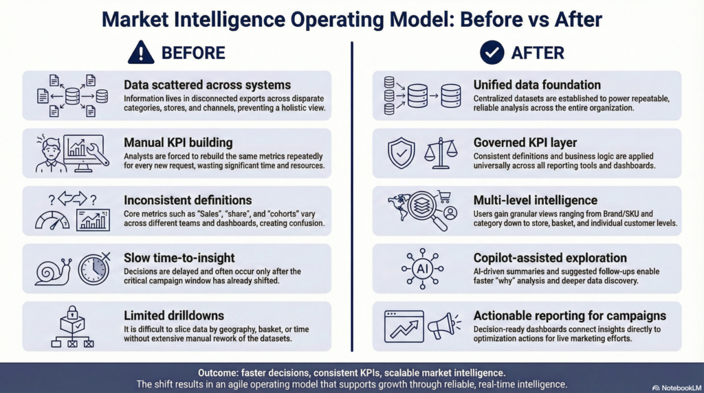 The business needed comprehensive reporting and analysis on market performance across SKUs, brands, categories, stores, shopping baskets, and consumers—at multiple geographic levels (national down to postal code) and across diverse time periods. The key constraint wasn’t “lack of data”—it was the lack of a coherent, scalable, self-serve system that teams could use daily to answer questions and optimize marketing actions.