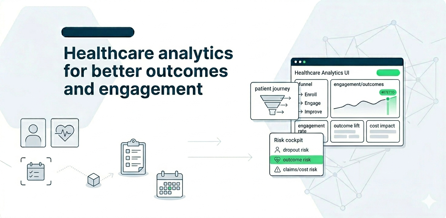 • Patient journey funnel (enroll → first engagement → sustained engagement → milestone outcomes)