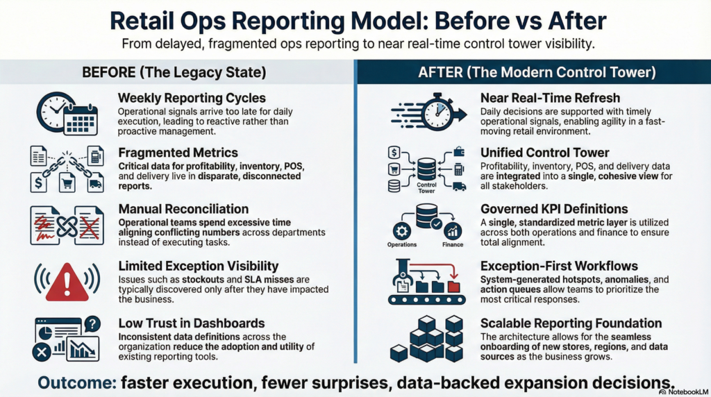 We aligned on outcomes that a COO/Head of Ops would care about: daily visibility, trusted KPIs, actionable exception handling, and forward-looking intelligence. The system needed to work for leadership (macro performance) and store/ops managers (micro execution).