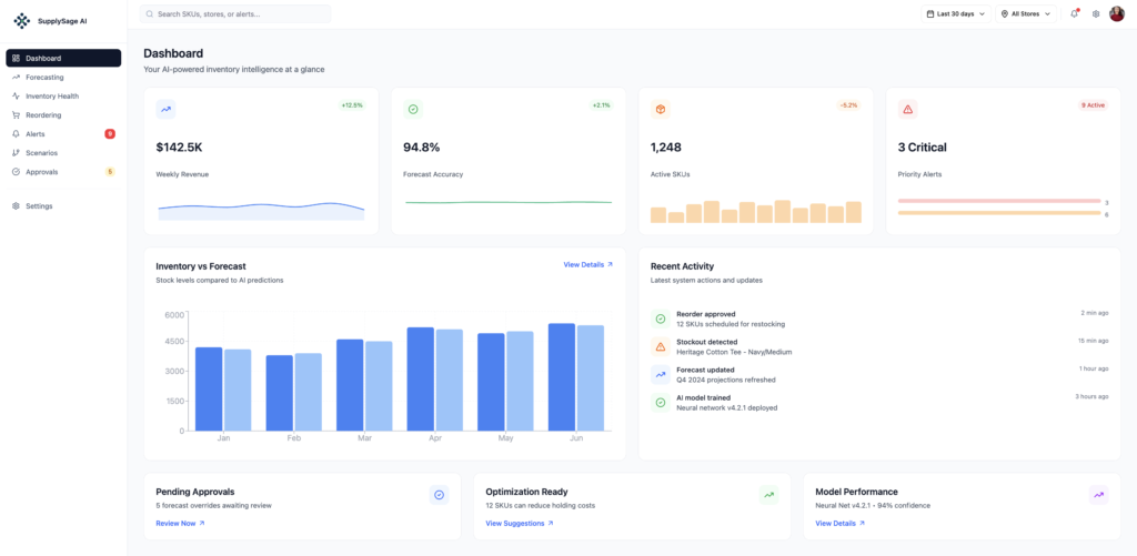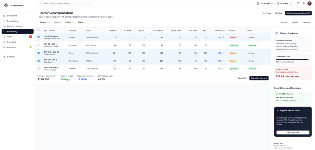 - Reorder recommendations dashboard (SKU-level replenishment actions with AI logic breakdown and approval workflow)