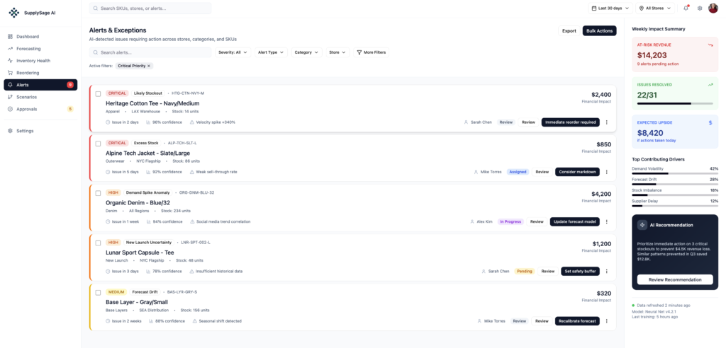 - Alerts that act: Exception alerts ranked by financial impact, assigned to owners, with recommended actions (e.g., “Immediate reorder required,” “Consider markdown,” “Set safety buffer”)